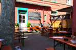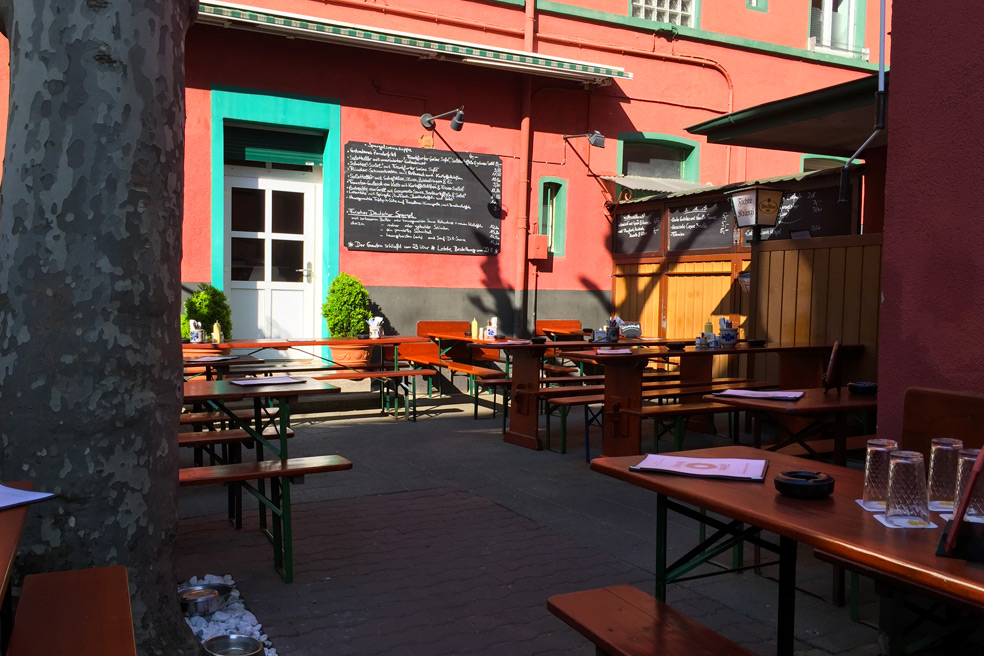 An warmen schönen Tagen lässt es sich gemütlich unter der großen, schattenspendenden Platane im Apfelweingarten vor dem Lokal sitzen. Sollte es doch mal einen kleinen Schauer geben, dann sorgen Markisen dafür, dass man sitzen bleiben kann. An 12 großen Tischen finden ca. 100 Gäste Platz.
